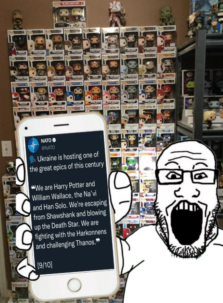 The main question is, Are the people still listening? Propaganda gives us a compelling narrative that we can all agree with, but do we even all agree anymore on the shifting narratives? While the media spoon-feeds us our preferred “Joussaince” or outrage of the day, what entertainment and pleasures we still enjoy, casual dopamine hits thinly veiled as excuses to fund the mass murder of 80s retrowave bogeyman, did they ever stop to think, Are we all still on board? Hey, check out the new episode of sports ball, and keep wishing our missiles murdered more Russians than they can murder Ukrainians. Can we kill them fast enough? Are you enjoying this show yet? Got my GDP hard-on.