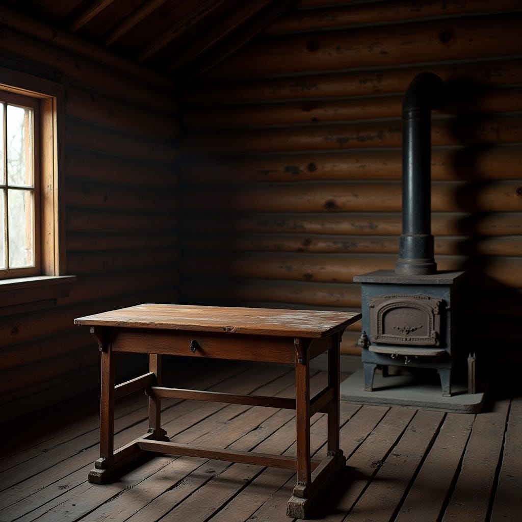 I can finally feel the echos of my history swelling and building deep within my bosom again. A new sense of this life. Just the night before, in the city, I had felt so lost and without hope, alone, no longer recognizing those around me; staggering through this decrepit time. But when I awoke in this cabin, I felt at home again, at peace. It must have been in a sleepwalking state last night that I wrote my heart out at this very desk. Such a fine desk at that – its top a beautiful dark mahogany slab that has clearly stood the test of time better than I. A candle melted artfully over its corner as I wrote and wrote and wrote. It seems last night I had been industrious in other ways as well, as I had clearly gathered some wet, soft pine to erect myself a makeshift bed. I do not have even a single memory of falling asleep upon my wet rags in the audience of such a glorious fire. But that is how I had awoken at some point during the night. I remember this one detail oh so well. The smell of a life’s memories mixed effortlessly with the cozy, warm whiff of burning pine. This fire in my heart burned and blazed so brightly during that dark evening.